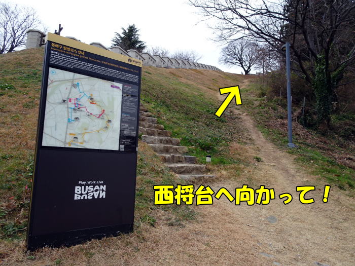 東莱邑城の本丸?ともいうべき場所の北将台に向かっていきます。北門からまた山の尾根沿いを歩きます。