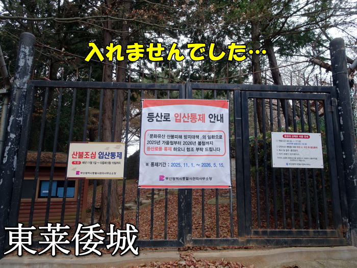 そうこうしてたどり着いた東莱倭城。日本軍が築いた城です。しかし中に入れず。入口の案内を見てみると、山火事防止のため11月~5月15日までは中に入れないとのこと。
