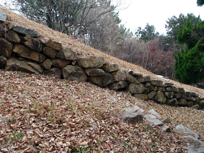 東莱倭城から駅に向かう途中、山の斜面に築かれた石垣を発見。当時のものか復元かわかりませんが、彦根城(滋賀県)などで見ることができる登り石垣みたいでした。