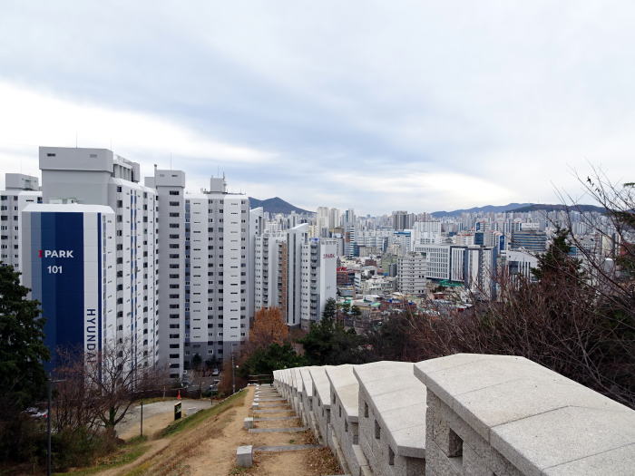 復元された城壁に沿って登って…少し休憩(←早い)。振り返ると釜山市の町並みが見えます。すごく開発されていてビルばかりです。