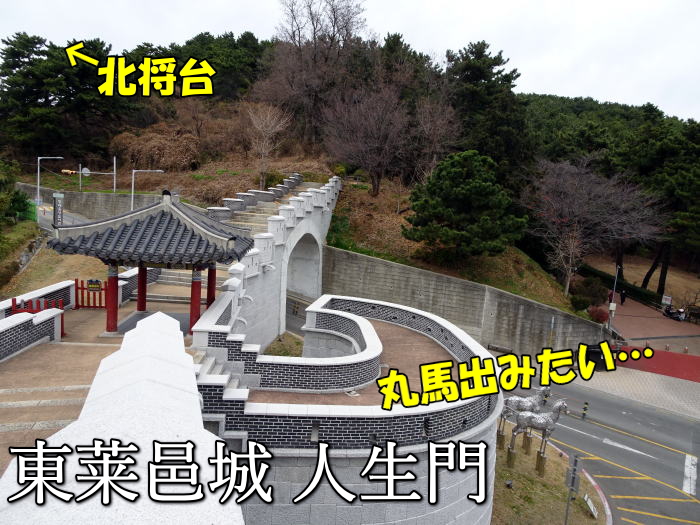 本丸の北将台から坂を下ること10分ほど。東莱邑城の東門みたいな人生門にたどり着きます。この人生門も復元で、よく見ると丸馬出しみたいなものがありました。日本の丸馬出は堀と土塁ですが、この門は石造りの丸馬出です。